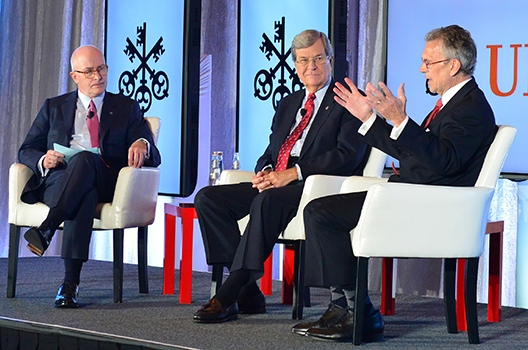 He introduced former Senate Majority Leader Tom Daschle and former Senate Majority Leader Trent Lott, who spoke with Bob McCann, Chairman UBS Americas, on the state of the elections and the future of America.